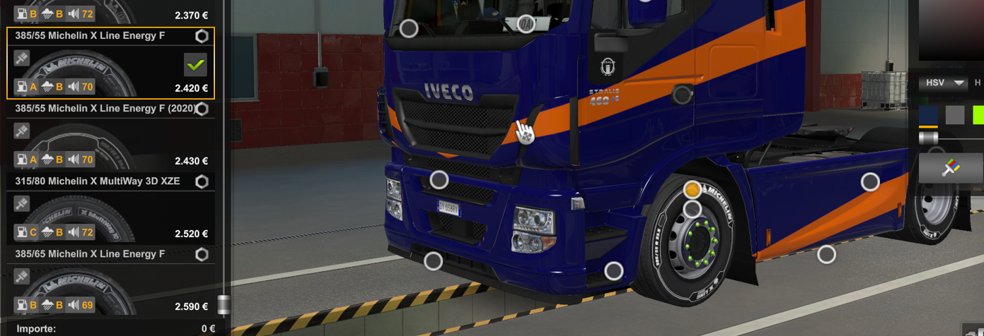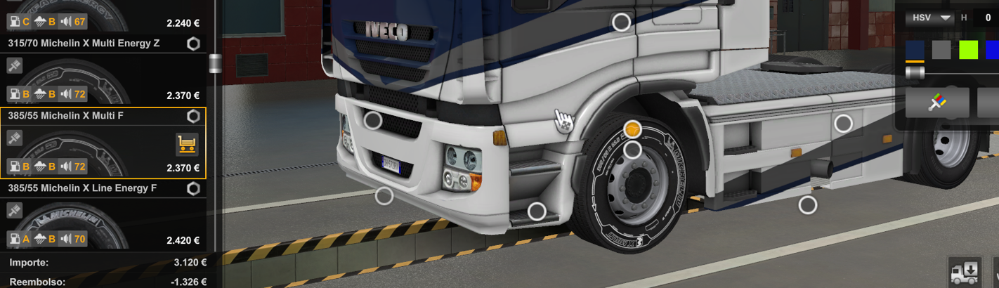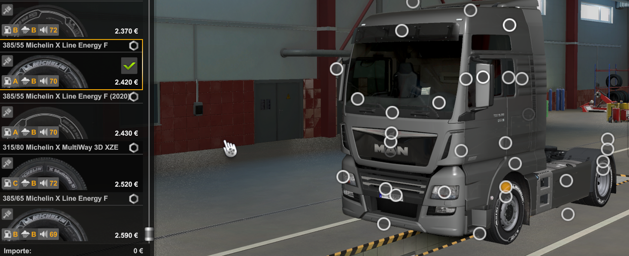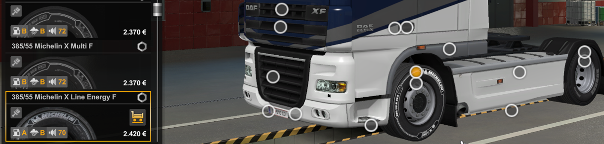 in the last screenshot in front, Michelin 385/55 is installed, and on the midlift - default